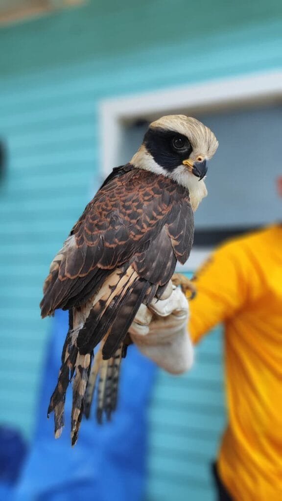 As equipes, que atuavam em operação conjunta com a Secretaria de Meio Ambiente, Clima e Saneamento, se deslocaram até o endereço indicado e efetuaram o resgate. O animal foi identificado como gavião-sorridente — nome popular do gavião-reidor (Herpetotheres cachinnans) — e apresentava lesões nas asas, além de uma unha quebrada.