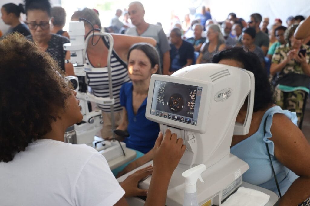 Profissionais de saúde durante a realização de exames oftalmológicos, garantindo atendimento qualificado à população.