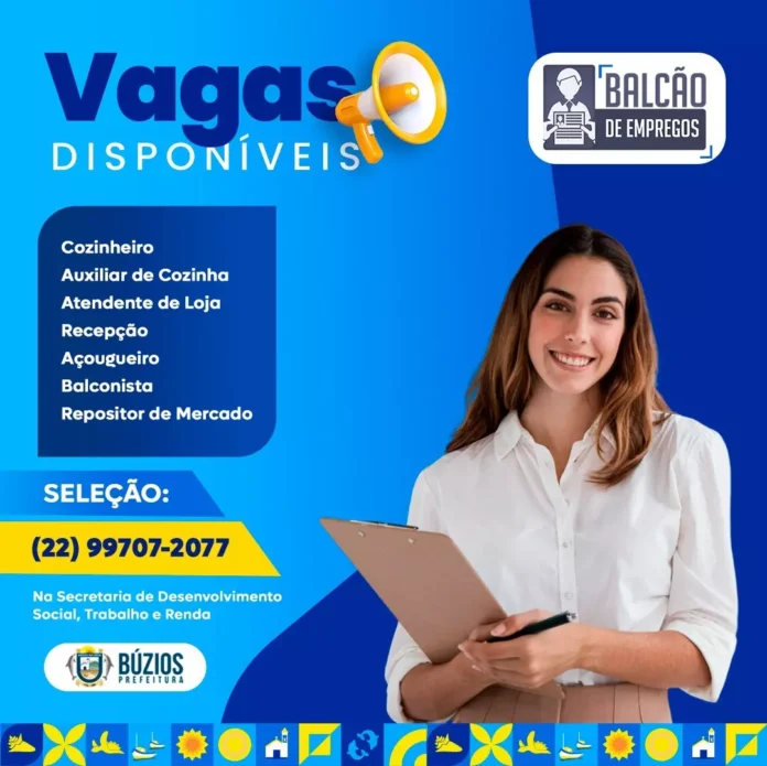 A Secretaria de Desenvolvimento Social, Trabalho e Renda de Búzios, por meio da Coordenadoria do Trabalho e Renda, disponibilizou novas vagas de emprego nesta sexta-feira (11). As vagas são para: Cozinheiro, Auxiliar de Cozinha, Atendente de Loja, Recepção, Açougueiro, Balconista e Repositor de mercado.