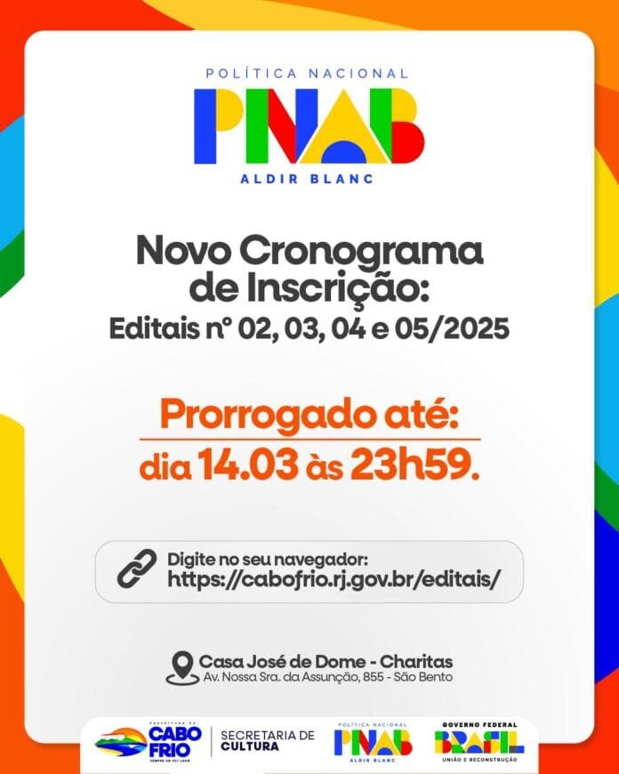 A Prefeitura de Cabo Frio, por meio da Secretaria Municipal de Cultura, informa a prorrogação do prazo de inscrição dos editais da Política Nacional Aldir Blanc (PNAB).