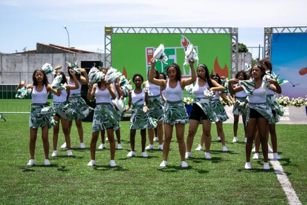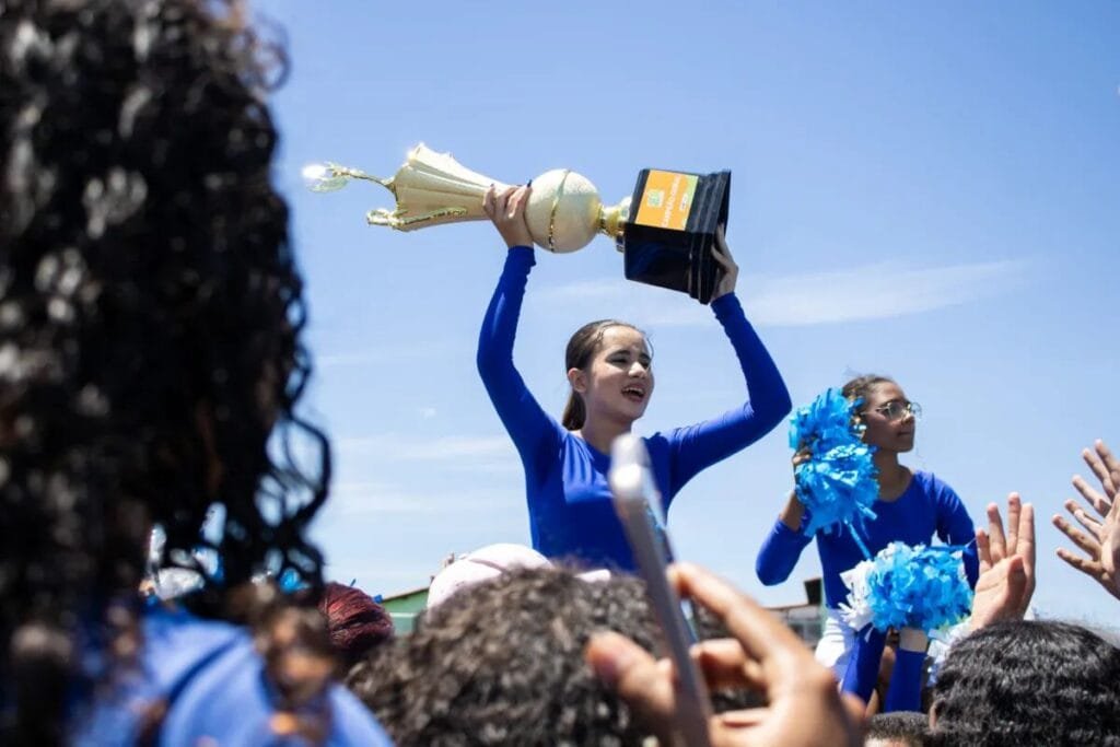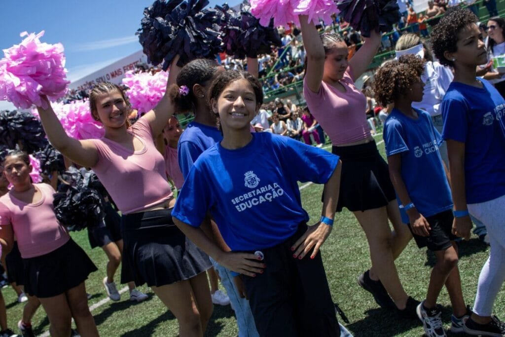 A programação começou com a mostra competitiva das equipes de cheerleaders, que empolgaram o público com coreografias cheias de energia. Em seguida, alunos da Escola Municipal Professora Catharina da Silveira emocionaram ao apresentar uma performance dedicada à “Educação Antirracista”, reforçando o compromisso da rede com respeito, diversidade e inclusão.